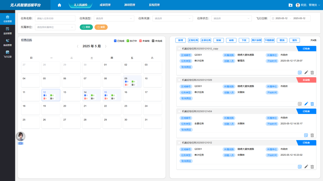 平台构建“预防-诊断-维护”一体化运维体系,涵盖异常预警、远程管控、多维度维护模块,为无人机、机巢及配件提供全生命周期智能守护,推动设备管理从“被动响应”升级为“主动运维”。
