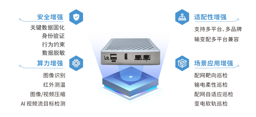 无人机巢边缘计算终端集成虚拟专用网络、安全加密认证、边缘计算等技术,内置飞控服务、安全加密认证、图像识别及前端视频流处理功能,具备完善的应用系统及丰富服务接口,支持多场景应用,包括独立运行或第三方平台接入。