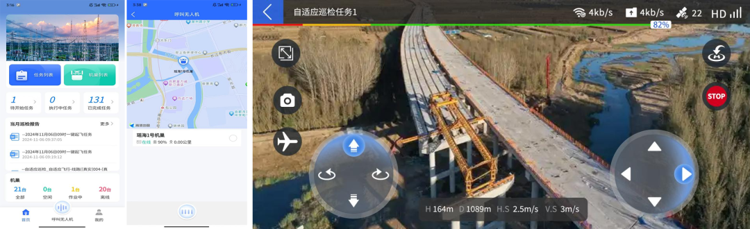 通过智能唤飞APP实时查看附近空闲无人机巢,可一键调度至现场执行应急巡视,实时回传作业画面并支持手动控制无人机深度巡视。