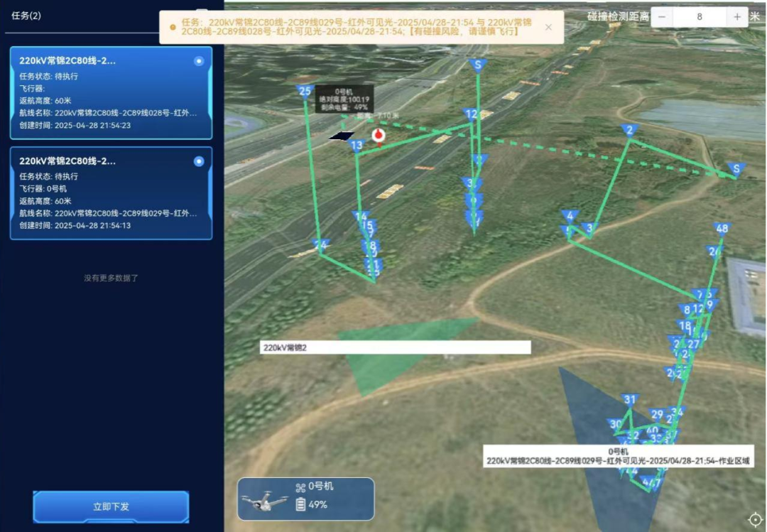 平台对规划航线进行毫秒级碰撞风险评估,针对多机轨迹交叉、高度冲突等风险全流程模拟推演,检测到碰撞风险时立即预警提醒规划人员。